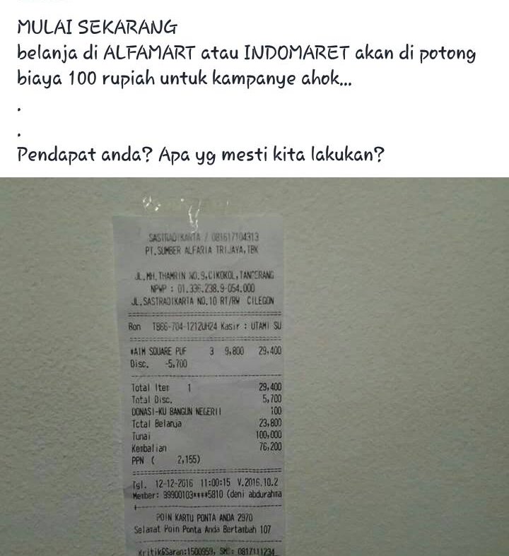 Belanja Di Indomaret / Alfamart Dipotong 100 Rupiah Untuk Donasi Kampanye Ahok