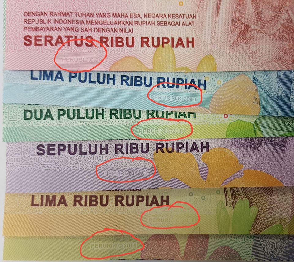 Selain itu, Eddy menjelaskan bahwa pada uang rupiah baru telah tercetak nama Peruri disertai tahun cetaknya yakni 2016. Sebagai contoh, pada uang rupiah nominal Rp 1.000 sisi belakang (yang terdapat gambar penari) tercetak teks Peruri TC 2016 di bawah tulisan seribu rupiah. Demikian seterusnya di pecahan lain, tulisan Peruri TC 2016 berada di posisi yang sama.