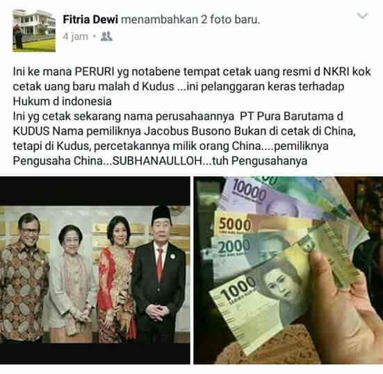 Lagi-lagi uang kertas tahun emisi 2016 menjadi sasaran pembuat berita hoax, setelah beredar kabar logo di uang kertas merupakan lambang palu arit, kali ini tersiar kabar di media sosial bahwa uang baru tersebut tidak di cetak oleh Perusahaan Umum Percetakan Uang Republik Indonesia (PERURI), melainkan oleh PT Pura Barutama yang berlokasi di Kudus.