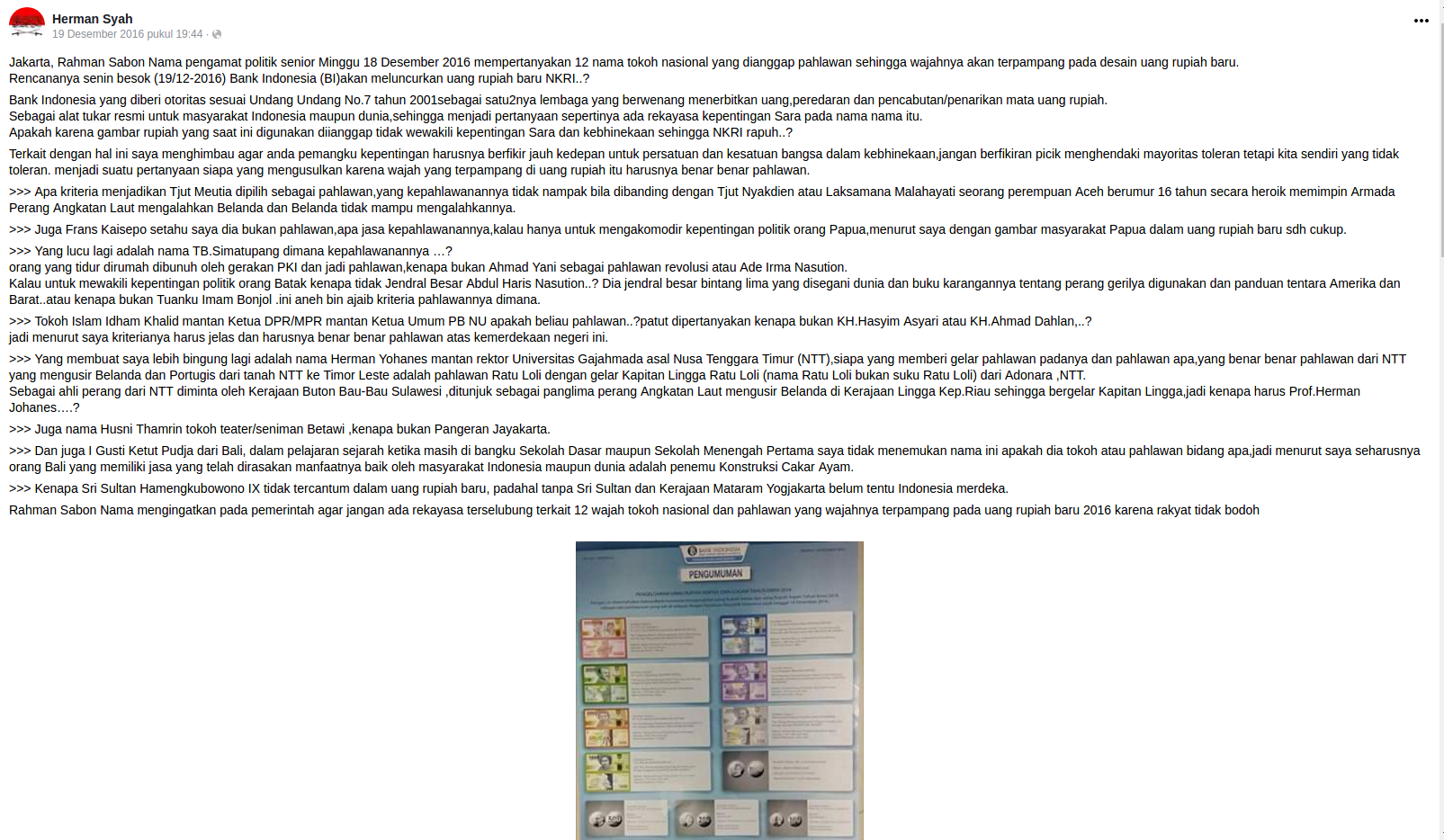 dari postingan tersebut, netizen mempertanyakan kriteria pahlawan yang pantas mengisi foto di pecahan uang kertas dan logam Rupiah baru. namun, faktanya pemilihan ke 12 tokoh tersebut telah melalui proses cukup panjang dan selektif yang dilakukan oleh Bank Indonesia (BI).