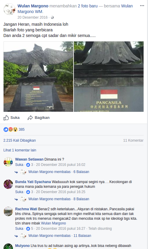 Media sosial kembali dihebohkan lewat postingan seseorang di facebook. dalam postingan tersebut terdapat foto burung Garuda yang menjadi lambang Negara Republik Indonesia. namun yang menjadi perdebatan bukan patung burung itu melainkan tulisan Pancasila disertai terjemahan dengan huruf cina. hingga screen shoot diambil, postingan tersebut telah dibagikan sebanyak 2.215 kali,
