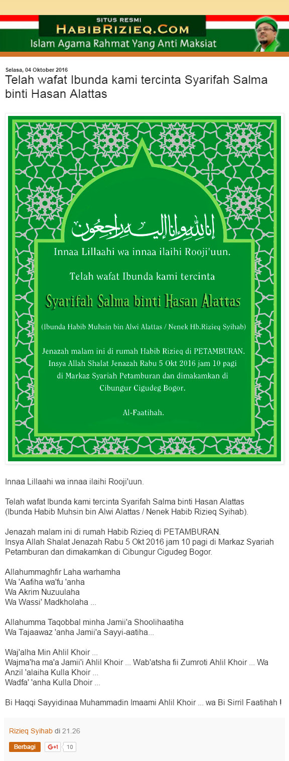 Kunjungan Sylviana awal bulan lalu itu pribadi tanpa ditemani Agus Harimurti Yudhoyono adalah untuk bertakziah atas wafatnya almarhumah Syarifah Salma binti Hasan Alattas, nenek dari Habib Rizieq Shihab.