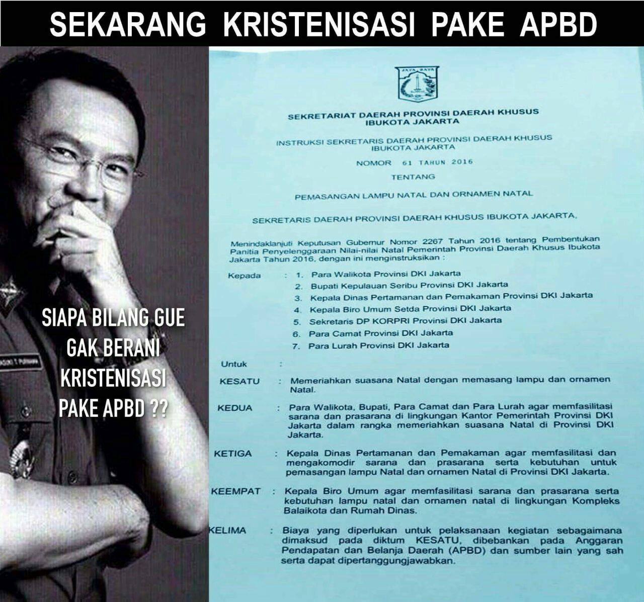 Ahok melakukan Kristenisasi di DKI, dengan menggunakan APBD. Yaitu dengan membuat Surat Instruksi untuk memasang hiasan Natal pada tanggal 1 Desember 2016.