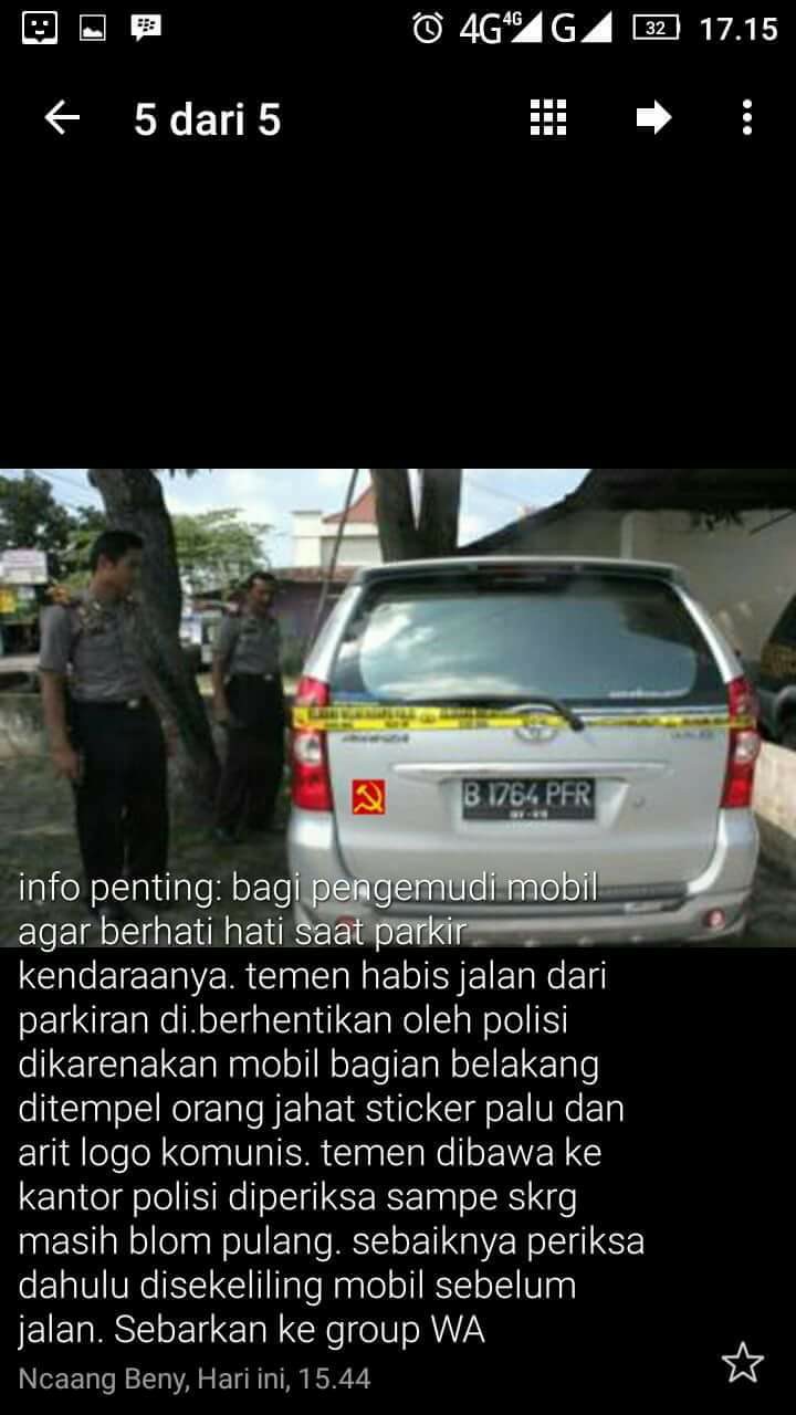 Beredar foto sebuah mobil yang memiliki stiker palu arit yang menempel pada bagian belakang mobil tersebut. klaim dalam gambar ni berbunyi : "info penting: bagi pengemudi mobil agar berhati hati saat parkir kendaraannya. temen habis jalan dari parkiran di.berhentikan oleh polisi dikarenakan mobil bagian belakang ditempel orang jahat sticker palu dan arit logo komunis. temen dibawa ke kantor polisi diperiksa sampe sekarang masih blom pulang. sebaiknya periksa dahulu disekeliling mobil sebelum jalan. sebarkan ke group WA"