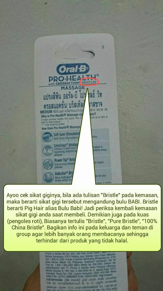 “Akhir-akhir ini dunia maya diributkan dengan kuas atau sikat/sikat gigi yang terbuat dari “bristle” karena dianggap PASTI dari babi. Walaupun kita dituntut waspada, namun tidak semua istilah bristle selalu mengacu kepada bulu babi.