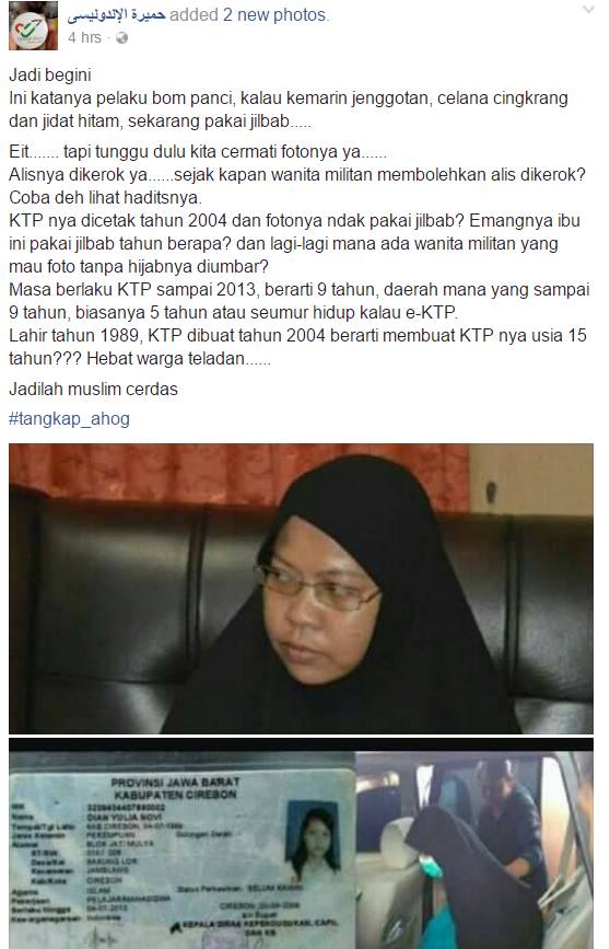 KTP nya dicetak tahun 2004 dan fotonya ndak pakai jilbab? Emangnya ibu ini pakai jilbab tahun berapa? dan lagi-lagi mana ada wanita militan yang mau foto tanpa hijabnya diumbar?