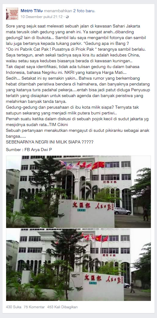 Foto yang diupload dalam postingan adalah gedung kantor Guo Ji Ri Bao, harian nasional bahasa Mandarin milik grup Jawa Pos, bukan pabrik cat seperti klaim pada narasi hasut.