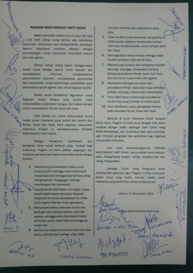 Alhamdulillah, meski malam itu kami cuma tidur sebentar, Piagam Masyarakat Anti Hoax bisa selesai kami print, dengan sebelumnya mendapat masukan dari beberapa rekan netizen. Dan Piagam tersebut yang menjadi bekal kami untuk bertemu Kapolri.