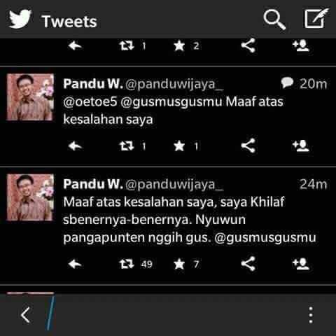 “Nyuwun pangapunten atas kesalahan dalem, mugi2 @gusmusgusmu lan santrinipun maringi ngapunten,” tulis Pandu Wijaya yang merupakan sosok kelahiran 1991 ini.