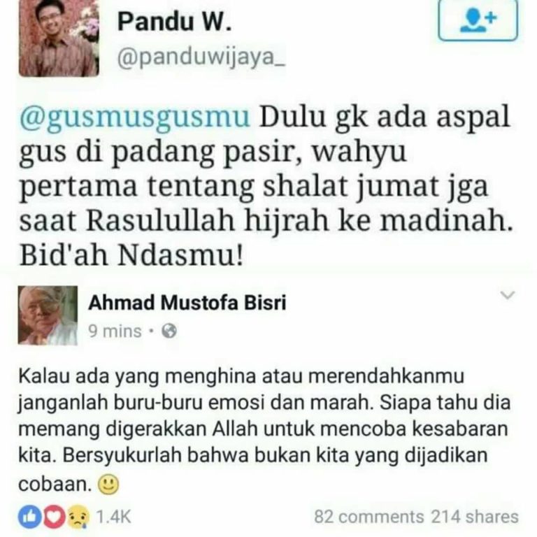 “@gusmusgusmu Dulu gk ada aspal Gus di padang pasir, wahyu pertama tentang shalat jumat jga saat Rasullullah hijrah ke Madinah. Bid’ah ndasmu!” cuit Pandu Wijaya yang kini mengunci akun Twitternya.