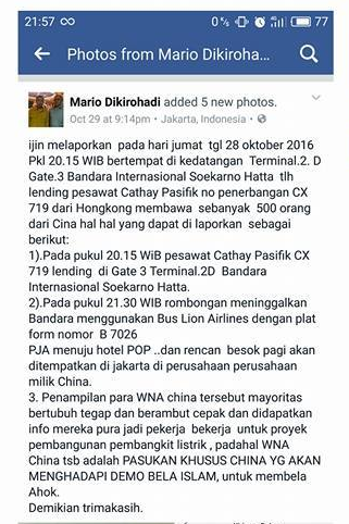 (HOAX) : 500 WN China Datang ke Jakarta untuk Bela Ahok