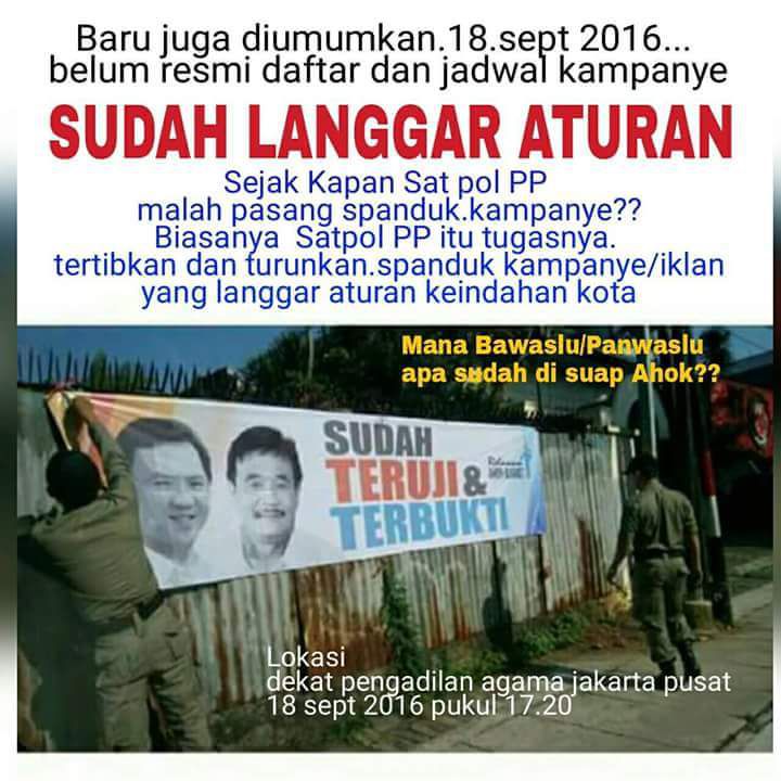 Ada tulisan dalam meme itu, berbunyi, “Baru juga diumumkan 18 September 2016… belum resmi daftar dan jadwal kampanye, sudah langgar aturan. Sejak kapan Satpol PP malah pasang spanduk kampanye?? Biasanya Satpol PP itu tugasnya tertibkan dan turunkan spanduk kampanye/iklan yang langgar aturan keindahan kota. Mana Bawaslu/Panaslu apa sudah disuap Ahok?”