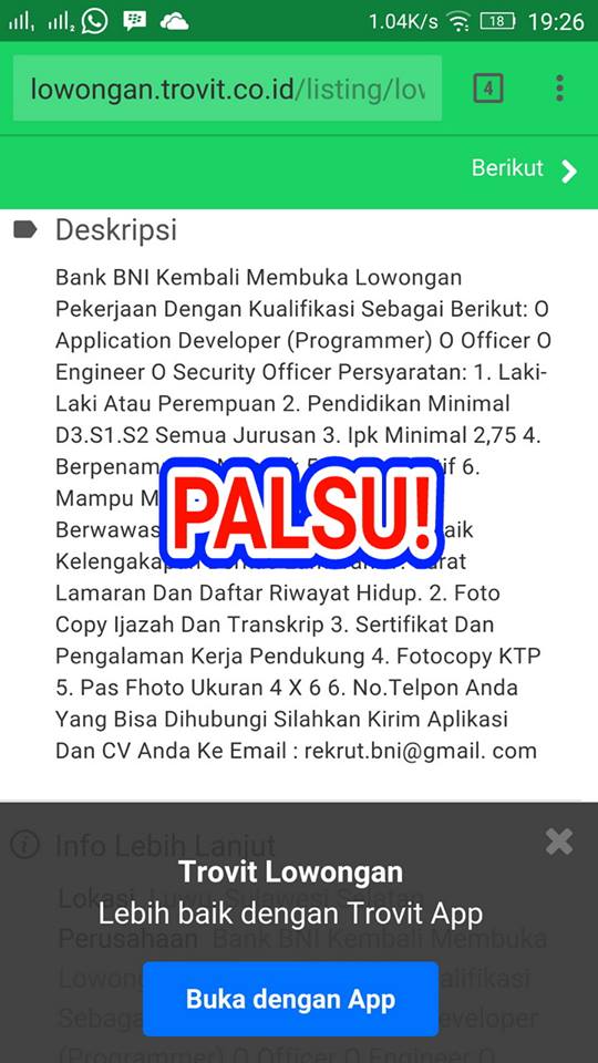 HOAX seperti ini menjadi hoax yang paling disayangkan karena cukup membuat harapan palsu bagi mereka yang sedang mencari pekerjaan. setelah ditelusuri ternyata info tersebut adalah palsu melainkan hoax. bagi kalian yang mendapat pesan seperti berikut tentunya harus lebih berhati-hati dan jangan mudah percaya begitu saja.