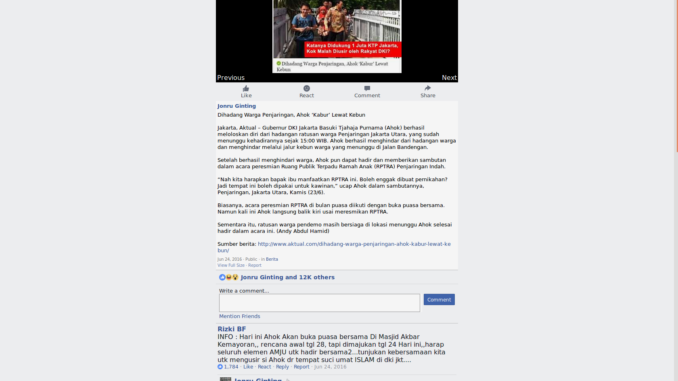 Jonru membagikan informasi “Dihadang Warga Penjaringan, Ahok ‘Kabur’ Lewat Kebun” menggunakan foto yang tidak sesuai. Foto yang digunakan adalah pada saat Ahok menyeberang di jembatan penyeberangan kearah Gedung BPK yang lokasinya bukan di Penjaringan.