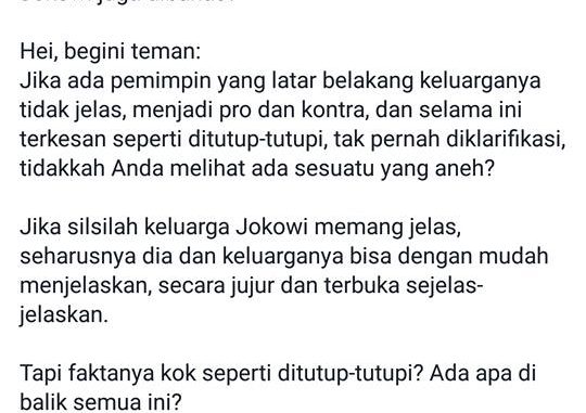 Jika silsilah keluarga Jokowi memang jelas, seharusnya dia dan keluarganya bisa dengan mudah menjelaskan, secara jujur dan terbuka sejelas-jelaskan.