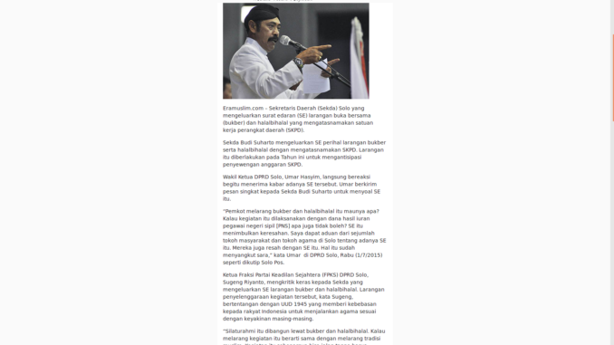 Ketua Fraksi Partai Keadilan Sejahtera (FPKS) DPRD Solo, Sugeng Riyanto, mengkritik keras kepada Sekda yang mengeluarkan SE larangan bukber dan halalbihalal. Larangan penyelenggaraan kegiatan tersebut, kata Sugeng, bertentangan dengan UUD 1945 yang memberi kebebasan kepada rakyat Indonesia untuk menjalankan agama sesuai dengan keyakinan masing-masing.