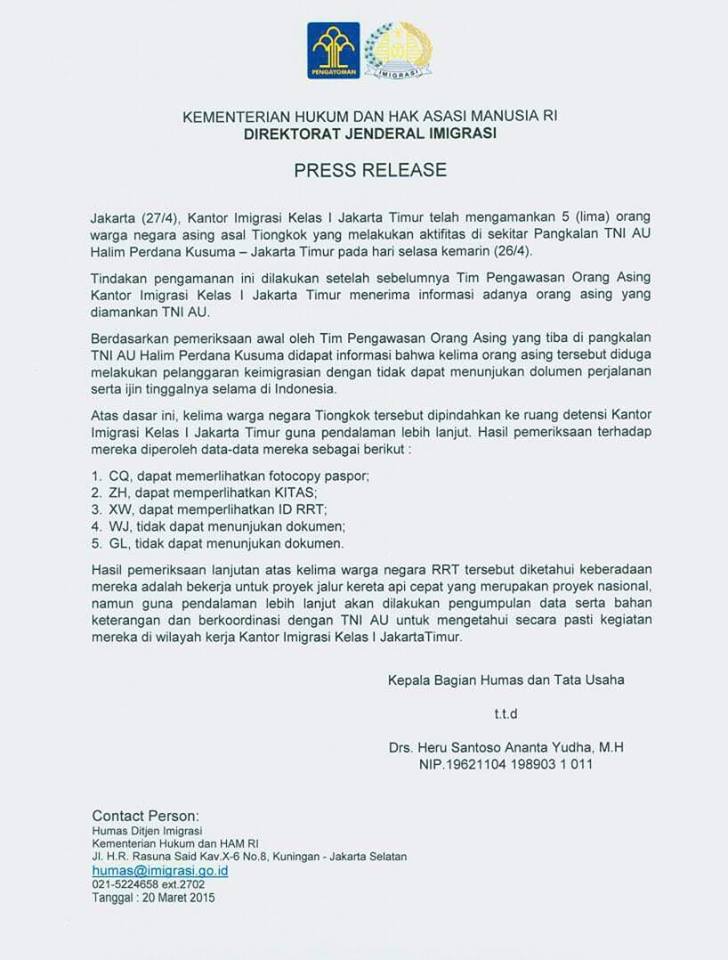Dikutip dari detik.com, Danlanud Halim Kolonel Pnb Sri Mulyo Handoko, menginformasikan status pekerjaan kelima WN China itu.
