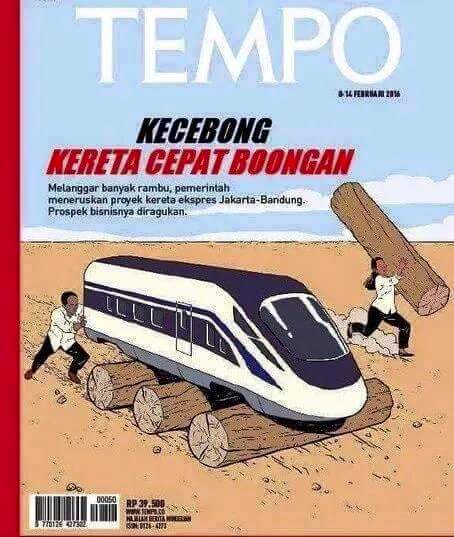 Terdapat meme dengan gambar cover majalah tempo, bergambar jokowi yang sedang mendorong kereta dengan tulisan : KECEBONG KERETA CEPAT BOONGAN