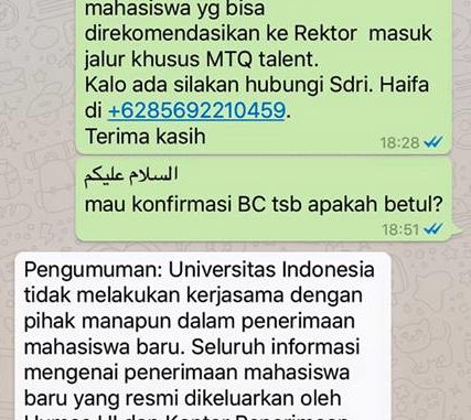 “Pengumuman: Universitas Indonesia tidak melakukan kerjasama dengan pihak manapun dalam penerimaan mahasiswa baru. Seluruh informasi mengenai penerimaan mahasiswa baru yang resmi dikeluarkan oleh Humas UI dan Kantor Penerimaan Mahasiswa Baru UI. Mohon waspada pada pihak-pihak yang mengatasnamakan UI dan menjanjikan kemudahan untuk diterima di UI. -Kantor Humas dan KIP UI-,” jawab Haifa, perwakilan UI yang namanya tercantum dalam pesan berantai itu, dalam keterangan tertulis melalui pesan whatsapp kepada masyarakat.