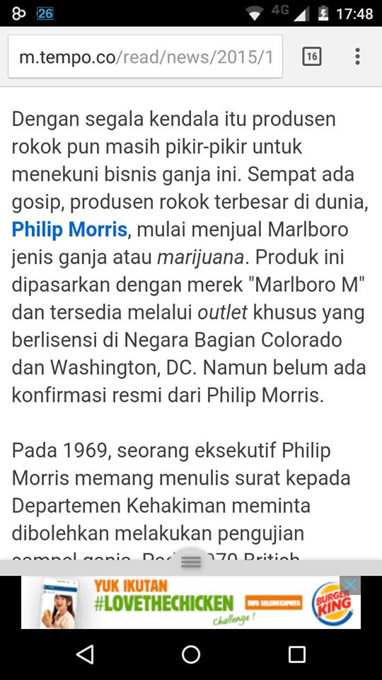 Produsen rokok Phillip Morris mulai menjual jenis rokok yang menggandung ganja atau marijuana. Produk ini dipasarkan dengan jenis “MARLBORO M” dan tersedia di outlet khusus yang berlisensi di negara bagian Colorado dan Wshington DC.