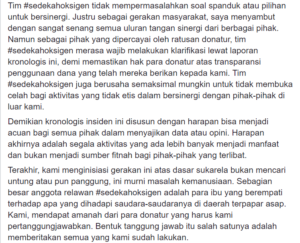Tim #sedekahoksigen tidak mempermasalahkan soal spanduk atau pilihan untuk bersinergi. Justru sebagai gerakan masyarakat, saya menyambut dengan sangat senang semua uluran tangan sinergi dari berbagai pihak. Namun sebagai pihak yang dipercayai oleh ratusan donatur, tim #sedekahoksigen merasa wajib melakukan klarifikasi lewat laporan kronologis ini, demi memastikan hak para donatur atas transparansi penggunaan dana yang telah mereka berikan kepada kami. Tim #sedekahoksigen juga berusaha semaksimal mungkin untuk tidak membuka celah bagi aktivitas yang tidak etis dalam bersinergi dengan pihak-pihak di luar kami.