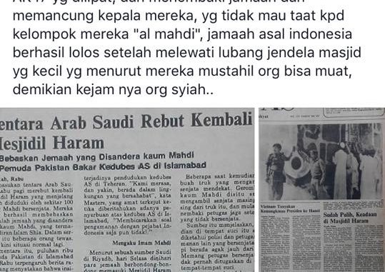 Dapet berita dari koran lama edisi pnri, tentang penyerbuan kaum syiah pada musim haji 20 november 1979 di masjidil haram, mereka tepat menyandera imam tepat setelah solat subuh dengan menggunakan senjata AK47 yang dilipat, dan menembaki jamaah dan memancung mereka yang tidak mau taat kepada kaum mereka ” al mahdi” , jemaah indonesia berhasil lolos setelah melewati liubang jendela masjid, yang kecil yang menurut mereka mustahil orang bisa muat, demikian kejamnya orang syiah.