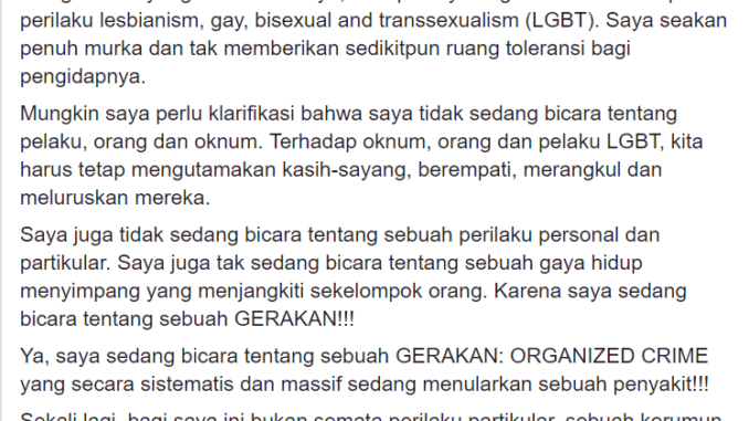 Pada intinya tulisan itu mengingatkan masyarakat pembaca tentang bahaya gerakan LGBT. Si penulis bahkan menggambarkan gerakan LGBT itu sebagai kejahatan terorganisir (organized crime) yang secara sistematis dan massif sedang menularkan penyakit. Kata si penulis, yang dihadapi Indonesia bukan lagi sekadar perilaku partikular, kerumunan atau gaya hidup, melainkan sebuah MOVEMENT.